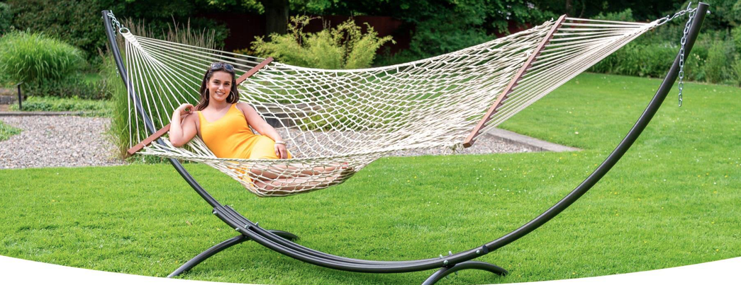 Si tenéis árboles en el jardín, otro gran lujo, y se encuentran a una distancia mínima de dos metros y medio aproximadamente, podréis colocar la hamaca con cuerdas de los árboles de una manera muy, muy sencilla pero, si no es así, no pasa nada. También las podéis encontrar con elegantes estructuras de madera que darán un toque «chill-out» a vuestro jardín o terraza.