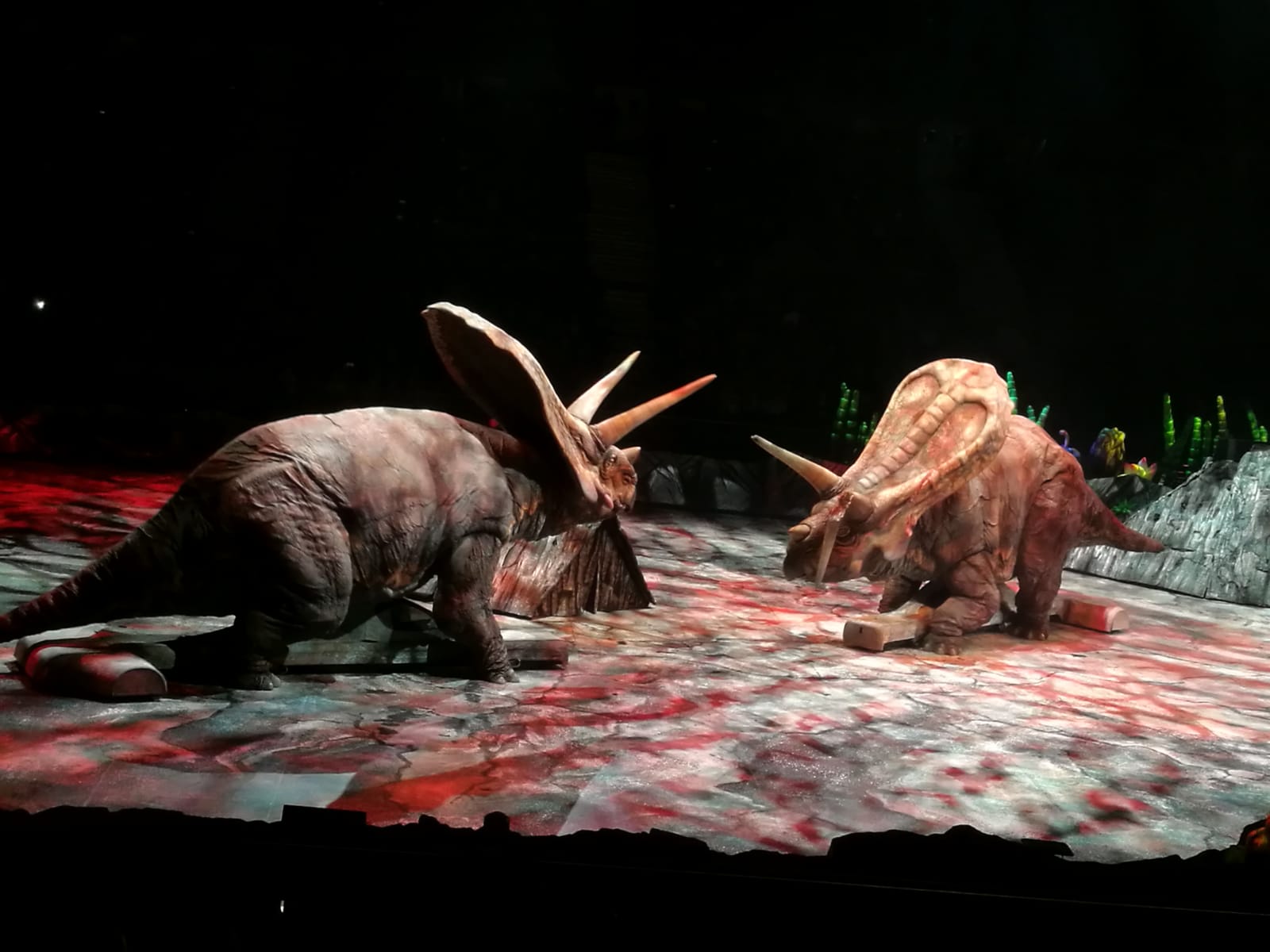 Seguro que la gran mayoría habréis visto la película de Parque Jurásico, cómo clonaron a las especies ya desaparecidas a partir del ADN extraído de mosquitos fosilizados en ambar. Pues lo han vuelto a hacer. Por supuesto, no son reales, pero lo parecen. Jamás había visto a dinosaurios a tamaño real, moverse con tanta similitud a lo que hemos podido ver en cine y documentales, con los sonidos tan fielmente reproducidos, interactuando en su propio hábitat con miembros de su misma especie y de otras diferentes. No puedo ni imaginar el trabajo que debe llevar recrear este grandioso espectáculo, ni los ensayos para llevarlo a escena.