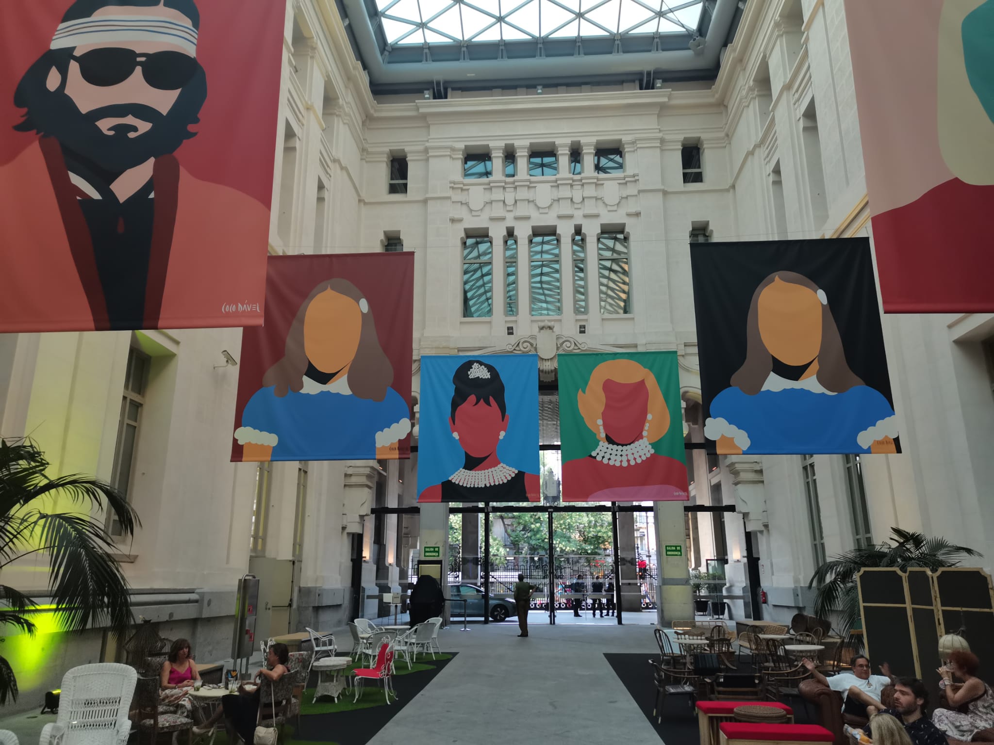 Como decimos, el entorno de restauración está ambientado en el cine, como no podía ser de otra manera. Allí destacan las grandes pinturas colgadas del altísimo techo. Pinturas de estética colorista y pop art, obra de la artista Coco Dávez. El título de esta exposición pictórica es Faceless y Coco ha retratado a sus ídolos más admirado de todos los tiempos. Las gemelas de El Resplandor; los protagonistas de Pulp Fiction o los de Grease… son solo algunos de los ejemplos de estos magníficos retratos que dan colorido al Palacio de Cibeles y dejan boquiabierto al visitante cuando accede al recinto. Por cierto, que al recinto se accede por la entrada principal del Palacio de Cibeles, la puerta que está frente a la fuente de la Diosa. Os animamos a disfrutar de esa magnífica entrada a uno de los edificios más espectaculares de la capital. Una auténtica tarta nupcial. Y de su interior, con las vidrieras en las cúpulas. Pasaréis por un arco de seguridad y os indicarán dónde están las taquillas de acceso a la Galería de Cristal.