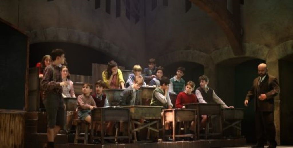 ¡Qué bonito, el musical de Los Chicos del Coro! Te toca el corazón desde que comienza la historia. Al entrar en el Teatro La Latina ya se adivina una escenografía potente, con la entrada del internado Fondo de Estanque y una gran verja cerrada. En la primera escena aparece el pequeño Pepinot, sentado sobre su maleta, esperando a sus padres porque vienen a buscarlo el sábado y este es el primer encuentro de Clément Mathieu al llegar a su nuevo puesto de profesor sustituto. Esta primera escena ya te remueve por dentro. Pepinot se gana al público desde el principio.