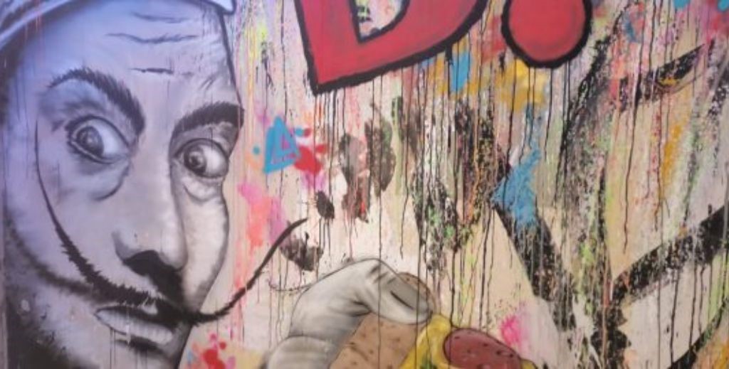 Nada más entrar, en la parte de abajo, un luminoso que reza “La pizza canalla”, nos recibe, junto a una barra. Toda la pared del lateral izquierdo, la decoran fotos instantáneas, de los visitantes más Bizziosos que han pasado por el local. De hecho, nosotras nos hicimos y firmamos nuestra propia foto y también hicimos lo propio en el carro de las pizzas. Subiendo unas molonas escaleras, “solo aptas para Bizziosos”, llegamos a la parte principal del local, donde nos llamó la atención el mural de Dalí, comiendo pizza, así como las fotos de personajes históricos y artistas famosos que esperan sentados su turno para degustar una de las delicias del local. Todo ello aderezado con grafitis fluorescentes. ¡Una pasada!