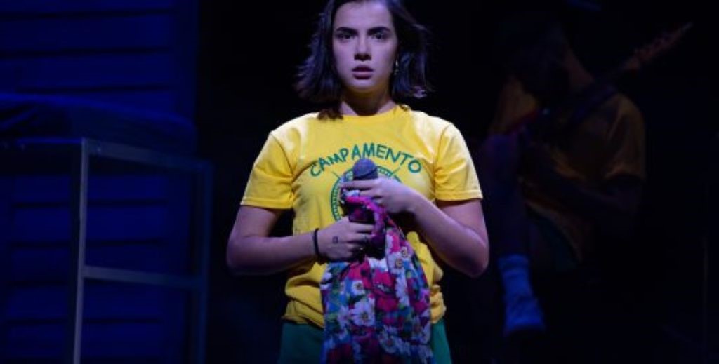 Es increíble cómo este musical consigue transportarte al campamento de “La Brújula” en un espacio acotado como el escenario. En él, tan solo hay una litera, que representa la cabaña de las protagonistas, María y Susana, y una cruz grandísima de neón, que preside la escena. También está, en una plataforma, la banda, que ocupa el 70% del escenario. Las guitarras eléctricas, el teclado y la batería de los músicos que, vestidos con el uniforme del Campamento, son parte de la escena sin llegar a inmiscuirse en la trama, pero sin mantenerse totalmente al margen de la misma. Algo muy distinto al resto de los musicales, en los que los músicos se ubican en un foso u ocultos en otro lugar de la escena. Esto me encantó porque ¿no es la música, en directo, una parte fundamental? Como decía, el escenario del madrileño Teatro Lara se convierte, sin necesidad de grandes cambios de escenografía, en el campamento segoviano de “La Brújula”. Aunque no solo se ciñen a las tablas como tal, sino que el escenario pasa a ser todo el Teatro. Los actores aparecen e interactúan por diferentes zonas: la entrada principal, una escalera luminosa que baja del palco, el pasillo del patio de butacas… Toda la sala se convierte en el campamento.