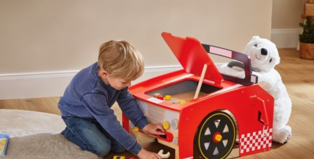 También nos hemos hecho con un coche mecánico de madera, cuyo capó se abre para guardar herramientas. Lleva volante, claxon, pedales, palanca de cambio, intermitentes y llave. ¡Nos habéis pillado! ¡Nuestros niños son unos frikis del bricolaje!