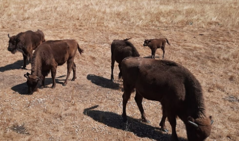 Sin embargo, el momento estrella es el encuentro con los bisontes, que acaban acercándose al remolque a la carrera y os hacen sentir como en una cinta de National Geographic. Es impresionantes verlos tan cerca, especialmente los ejemplares más altos que llegan a medir 1,85m a la cruz (es decir, en su parte más alta). Además, tuvimos la suerte de hacer esta visita cuando la manada cuenta con un nuevo miembros de unas pocas semanas de vida: tan parecido a los terneros, tan ágil y dulce. Disfrutamos mucho viendo el comportamiento de los demás bisontes con el más chiquitín.