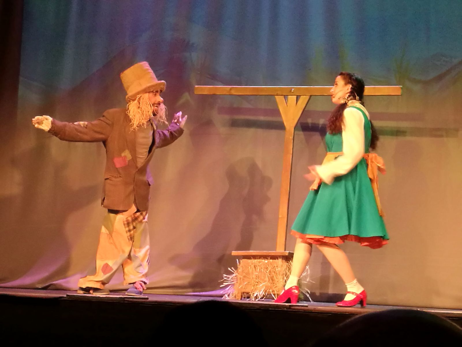 En la primera escena ya comprobé que Dorothy era ella y no una versión modernizada de la protagonista; con el vestido y las trenzas a lo Judy Garland y cuando entonó la canción ‘Sobre el arco iris’, con esa voz dulce y bonita, me convenció de todo. Ccreo que a mis hijas también porque las miré y estaban las dos con los ojos muy abiertos y cuando terminó la canción Pilar me dijo “mami, canta muy bien, pero ¿está triste?” La obra acababa de empezar y al poco tiempo mi peque pudo comprobar que la protagonista no estaba triste, sino deseosa de vivir aventuras. A partir de este momento, comenzó la diversión y entraron en escena el hada Glynda, el Espantapájaros, el Hombre de Hojalata, el León miedoso y por supuesto, la malvada Bruja del Oeste.