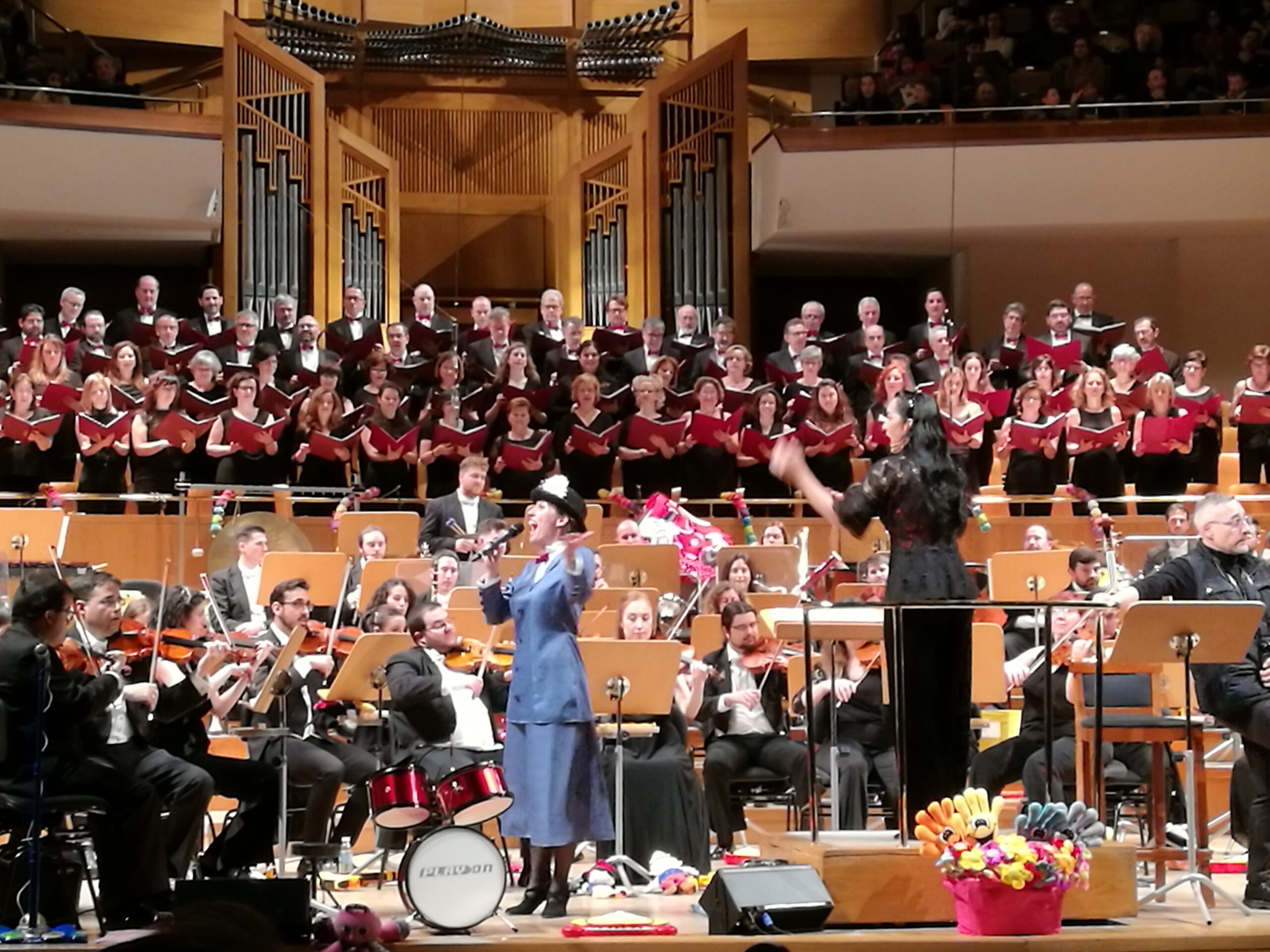 Llegadas las 11:30h, puntuales, orquesta y coro subían a un escenario adornado con toda clase de juguetes: Peppas Pig en algunos atriles, Bobs Esponjas en las manos de los violoncelistas, blancanieves colgando de los arcos de los violines, organillos de colores al frente decorando el escenario, xilófonos de juguete entre el viento madera, espadas láser entre los componentes del coro, grandes pistolas amarillas aparecían por sorpresa entre las violas, tambores forrados con conocidos personajes en la percusión… En definitiva, toda una fiesta para una mirada infantil que trascendía al sentido de la vista para colocarse como protagonistas en el del oído porque organillos, xilófonos y hasta las propias pistolas o espadas láser se convertían en elementos imprescindibles en temas tan aptos para niños como el bolero de Ravel o el Carmina Burana.